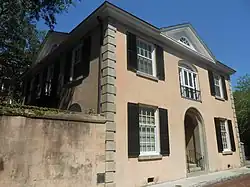 The Louis Gourd House is a Victorian house in Charleston, South Carolina which was once the carriage house of the Calhoun Mansion.[1] The house, built in the 1870s, once included eight stalls, space for carriages, and servants' quarters, but the interior was entirely removed as part of the building's conversion into a residence.[1] The Church Street portion of the lot was divided off from the Calhoun Mansion (facing on Meeting Street) and sold separately for the first time in 1932.[1] When the building was acquired by Mr. and Mrs. Louis Gourd in 1939, they quickly hired Charleston architect Albert Simons to plan to remodeling of the building.[1] The house he designed includes a main hall, living room, dining room, kitchen, gun room, and maid's quarters on the first floor with additional bedrooms and baths upstairs.[1] Ironwork on the front and rear of the house was designed by Mr. Simons and includes his initials in the corners.[1]