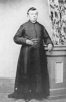 Joseph Pelletier was born in 1828 in Kamouraska, Quebec. He was ordained as a priest in 1853 and later settled in Caraquet in 1869. In 1874, he established a convent and entrusted its management to the Congregation of Notre Dame of Montreal. Pelletier strongly opposed Law 87 and advocated for a separate school system for the Catholic minority, similar to the arrangement in Quebec for the Protestant minority.[24]