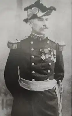 Promoted to lieutenant on 13 October 1882 in the 121st Line Infantry Regiment, Plessier transferred to the 3rd Marine Infantry Regiment on 5 July 1884.[3] He fought in the Sino-French War in Tonkin and Cambodia between 10 August 1884 and 9 December 1886 and, during an action at Angkor Chey on 12 June 1886, was wounded by a bullet in his left shoulder. Plessier was mentioned in dispatches for his actions in Indo-China, received the Tonkin Expedition commemorative medal and, on 7 July 1887, was appointed a chevalier of the Order of Cambodia.[5] Following his return from the campaign, on 12 November 1886 he was promoted to the rank of capitaine (captain).[3]