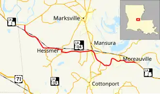 From the west, LA 114 begins at a T-intersection with LA 1 at the Red River in western Avoyelles Parish. This junction is located 1.6 miles (2.6 km) east of Echo, a small community in neighboring Rapides Parish and 2.9 miles (4.7 km) southwest of Fifth Ward. LA 114 crosses the Kansas City Southern Railway (KCS) at grade then follows the rail line southeast through a rural area known as Belle d'Eau. Here, the highway crosses Choctaw Bayou just outside the Grand Cote National Wildlife Refuge. After curving due east, LA 114 intersects LA 1188, which connects to LA 115 south of Hessmer. LA 114 continues into the village of Hessmer on West School Street and intersects LA 115 (Main Street), which connects to the nearby cities of Marksville and Bunkie. LA 114 turns south, running briefly concurrent with LA 115, before resuming an eastward course along East Main Street. Exiting Hessmer, LA 114 proceeds a short distance into the larger town of Mansura, where it becomes known as Baton Rouge Avenue.[2][3][4][5]
