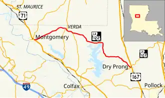 Louisiana Highway 122 (LA 122) is a state highway located in Grant Parish, Louisiana. It runs 26.10 miles (42.00 km) in an east–west direction from the junction of U.S. Highway 71 (US 71) and LA 1239-1 in Montgomery to LA 123 in Dry Prong.