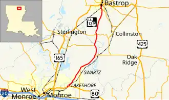 Louisiana Highway 139 (LA 139) is a state highway located in northeastern Louisiana. It runs 20.20 miles (32.51 km) in a north–south direction from U.S. Highway 80 (US 80) in Monroe to the junction of US 165, US 425, LA 2, and LA 593 in Bastrop.