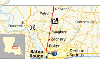 The route connects a string of communities projecting northward out of Baton Rouge, the state capital, including the small suburban cities of Baker and Zachary. It traverses two of the Florida Parishes, East Baton Rouge and East Feliciana, in a nearly linear fashion as the entire route parallels a railroad line.