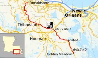 Louisiana Highway 308 (LA 308) is a state highway in Louisiana that serves Ascension, Assumption, and Lafourche Parishes. It spans 82.5 miles (132.8 km), following the east bank of Bayou Lafourche from Donaldsonville to Golden Meadow.[1] It parallels LA 1 during its entire route, as LA 1 follows the west bank of the bayou.