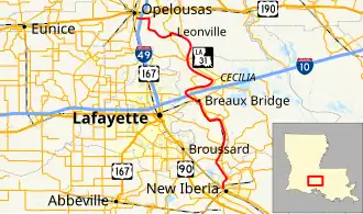 Louisiana Highway 31 (LA 31) is a 54.6-mile-long (87.9 km) north–south state highway in Louisiana that serves Iberia, St. Martin, and St. Landry parishes, extending from LA 182 in New Iberia, and ending at the same highway in Opelousas.[2]