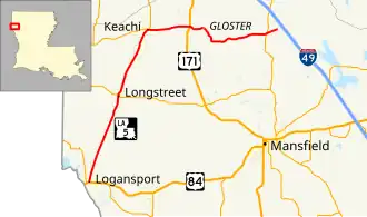 Louisiana Highway 5 (LA 5) is a state highway located in DeSoto Parish, Louisiana. It runs 28.36 miles (45.64 km) in a general southwest to northeast direction from U.S. Highway 84 (US 84) in Logansport to LA 175 in Kingston.[2]