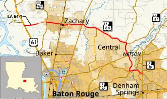 From the west, LA 64 begins at the intersection of LA 964 (Old Scenic Highway) and Mt. Pleasant–Zachary Road, both of which lead to US 61 and the city of Baton Rouge. LA 64 heads east through the East Baton Rouge Parish city of Zachary on Church Street, a divided four-lane thoroughfare, and passes several residential subdivisions. Just before the highway passes the local high school, the median is discontinued as the roadway narrows. LA 64 becomes a commercial corridor as the route curves southeast onto High Street then east again across the Canadian National Railway (CN) line onto Main Street.[3][4][5]