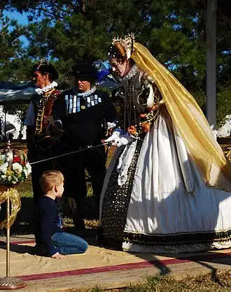 ![]() An actress (Kimberly Stockton), playing Queen Elizabeth I, knights a young visitor | |