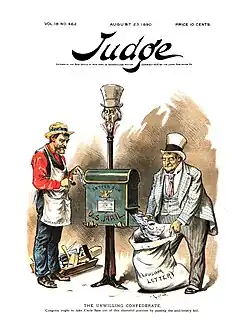 The Louisiana State Lottery became the most notorious state lottery and was known as the "Golden Octopus" as it reached into every American home using the U.S. Postal Service.[3] In 1890 the United States Congress banned the interstate transportation of lottery tickets and lottery advertisements, which composed 90% of the company's revenue. The Supreme Court of the United States upheld this statute in 1892.