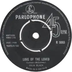 "Love of the Loved" is a song written mainly by Paul McCartney, credited to Lennon–McCartney. It is one of his earliest compositions and featured in the Beatles live act in their early days. The group recorded the song at their 1962 audition for Decca Records, but never issued it on any of their official releases. Instead, Cilla Black recorded it for her debut single, which was produced by George Martin. The single reached No. 35 on the UK Singles Chart in October 1963.[1]