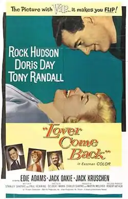 Lover Come Back is a 1961 American Eastmancolor romantic comedy film released by Universal-International Pictures and directed by Delbert Mann. It stars Doris Day and Rock Hudson and is their second time working together. The supporting cast includes Tony Randall, Edie Adams, Ann B. Davis, and Donna Douglas.