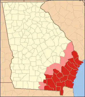 Southeast Georgia's Lower Coastal Plain, often referred to as the "Coastal Empire", is a subregion that encompasses the lowest-lying areas of the Atlantic coastal plain in the state, containing barrier islands, marshes, and swampy lowlands, as well as flat plains and low terraces.[1] It differs from Georgia's Upper Coastal Plain in that it is lower in elevation with less relief and wetter soils.[1] The United States Environmental Protection Agency defines the Lower Coastal Plain as an ecoregion, part of the larger, interstate Southern Coastal Plain.[1]