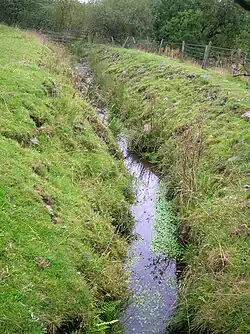 The name of the inflow and outflow burn indicates, as stated, a ford on this old road once used by cadgers or carriers on horseback of goods, including items such as Dunlop cheeses. The burn is the existing inflow and outflow from Lowes Loch to the Dusk Water; it has been canalised and greatly deepened to lower the level of Lowes Loch. The burn now flows into the Kirkleegreen Reservoir, built after 1858 and by 1891.[5] The waters of this old reservoir, now an angling loch, run into Cuffhill Reservoir and then into the Dusk Water via Threepwood Spout. The ford may have been where a culvert now carries the outflow of the small loch in front of Lows Cottage down towards Lowes Loch.