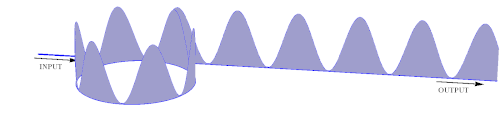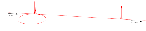 Figure 7 shows an example of the patterns that are generated, and travel along the cavity and out of the cavity. Like in the transverse case, also in the longitudinal configuration single or multiple Kerr cavity solitons can be generated; Figure 8 illustrates the case of a single cavity soliton that circulates in the cavity and produces a sequence of narrow pulses in the output. Such solitons have been observed for the first time in a fiber cavity.[14]