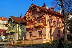 In 1902–1914, the architect Dušan Jurkovič created here a unique set of buildings in the style of folk Art Nouveau inspired by local natural environment. The appearance of his buildings influenced the entire urbanism of Luhačovice. The Jurkovič House from 1902 was his first building which belongs to the most famous and valuable objects in the spa. The hotel is decorated by fresco of Saints Cyril and Methodius by Jano Köhler. Other Jurkovič's folk Art Nouveau buildings include Chaloupka and Jestřabí hotels, a hydrotherapy institute with the Sunshine Spa swimming pool, Vlastimila and Valaška villas, a bandstand, and several building that have not been preserved.[11][10]