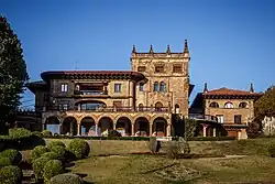 The Lezama Leguizamóns are not counted among the very top elite of Biscay industrial tycoons,[64] formed by the Ybarra, Martínez Rivas, Chávarri, Sota and Echevarrieta families;[65] however, they are listed as members of the emergent Basque oligarchy;[66] their name repeatedly comes up in history of Biscay industrialization[67] and their companies are listed among the most important ones in Bilbao in the first decades of the 20th century.[68] Their wealth and position was demonstrated by two buildings: Casa Lezama-Leguizamón in the downtown Bilbao, home to numerous corporate and other institutions,[69] and Palacio Lezama-Leguizamón, the family residential estate in Getxo. Both are considered iconic examples of Biscay architecture, made possible by fortunes of the new industrial and financial oligarchy.[70]