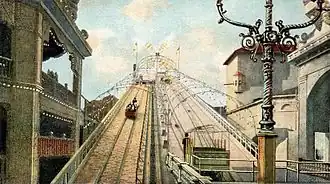 Before the 1917 season, the Luna Park Amusement Company acquired additional land, which was used as a parking lot.[99] In addition, the park's managers installed the Top, a massive steel structure that was designed to resemble a spinning top.[100][101] The toboggan and burro rides were destroyed in a fire in August 1917,[102][103] and a set for a mountain range burned down in March 1918.[104] As a result of the first fire, the toboggan and burro rides were rebuilt.[99] During the 1918 season, Luna Park's managers added several attractions about World War I, including a simulated battlefield.[105][106] The next year, Luna Park installed more war-related attractions,[107] and Henry Miller was appointed as the park's general manager.[84] The park also added shows such as the Darktown Follies and A Trip to Me-Lo-Die, as well as attractions including the Frolic, Over the Top (a variant of the Virginia Reel), the Tanks, and Treat-'em-Rough.[49]