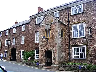 The Luttrell Arms is a Grade II* listed building and was constructed in the late fifteenth to early sixteenth centuries, with some later additions and alterations. It is built of rubble stone with a slate roof. The original part of the house consists of three storeys, while the porch, at the centre of the front, is two storeys high. Wings of lower height were added to left and right at later dates, and a wing at the rear of the main part once served as the hall. The main doorway has a carved stone heraldic emblem above the outer door opening, moulded stone copings and a saddle stone at the gable. The windows on the main wings are sash windows with glazing bars, mostly single width, but double width to the right and left of the porch. The leaded casement-type windows on the porch have moulded stone mullions. The interior features include a four-centred stone door frame, an oak door frame, an open fireplace, large moulded oak ceiling beams and exposed rafters. A ground floor room has a seventeenth century plaster ceiling and an upper floor room has an open roof of timber with moulded arch braces and purlins.[4]