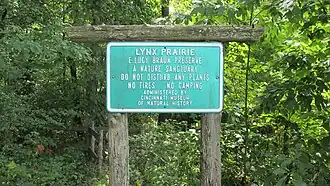 Lynx Prairie is owned by The Nature Conservancy and features 1.5 miles (2.4 km) of trail loops.[2] Parking for the preserve is at East Liberty Church and the trail head is marked at the southeast corner of the cemetery.