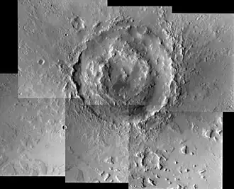 Lyot crater, featuring a central peak in the middle, stands out on the flat plains of Vastitas Borealis, which is generally flat and smooth with few large craters.[2] Lyot is the deepest point in the northern hemisphere of Mars.[3][4][5]
