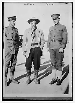 Upon returning to his family in 1908, Castillo began to challenge the dictatorship of General Porfirio Díaz. He had been strongly influenced by the writings of Díaz's recent political rival Francisco I. Madero. He joined Madero's revolution in 1910 and quickly became his personal bodyguard. In March 1911, Madero laid siege to Casas Grandes where he was reported wounded, although this was later denied.[2] Castillo saved his life, but their forces were repelled by Diaz's troops.[3] Just two months later, however, revolutionary forces captured Ciudad Juarez, putting an end to the Diaz government. Madero was elected to the Presidency in October of the same year. Castillo declined a prominent position in the capital and instead returned home with orders from Madero to bring order to the region. There, he replaced unpopular local officials with those supported by rurales, but he was not as successful in addressing local banditry.
