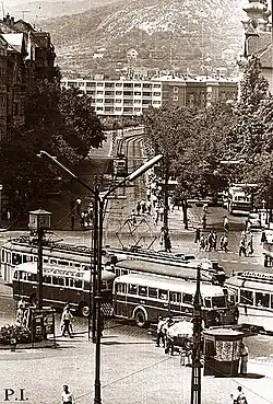 The main feature of the intersection is the Gomba, or Mushroom. This building, constructed in 1942 in the middle of the roundabout, featured shops as well as the electrical transformer distributing current to the significant tramway network. As it was in poor condition, the mushroom was earmarked for redevelopment in line with Budapest's cultural district and construction of the M4 metro.[1] The building was fully renovated by the summer of 2014.