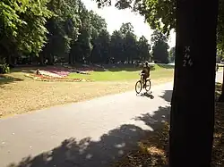 Münster claims to be the bicycle capital of Germany.[41] It states that in 2007, vehicle traffic (36.4%) fell below traffic by bicycle (37.6%).[42] The city maintains an extensive network for bicycles including the popular "Promenade" which encircles Münster's city centre. While motorised vehicles are banned, there are paths for pedestrians. Additional bicycle paths link all city districts with the inner city and special traffic lights provide signals for bicyclists.[42] Bicycle stations in Münster offer bicycle rentals.[42]