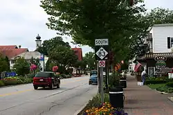The trunkline curves to the northwest around Bronner's Christmas Wonderland, which bills itself as the "World's Largest Christmas Store"; the store has 7 acres (2.8 ha) under one roof devoted to Christmas merchandise.[5] Further north, M-83 follows Main Street over the Cass River into downtown Frankenmuth. North of the river are Zehnder's and the Bavarian Inn, restaurants known for their "world famous" chicken dinners. The city is known as "Michigan's Little Bavaria"; the area was settled by German Lutherans in the 19th century.[6] Today, buildings and even road signs are erected in the Bavarian theme.[7]