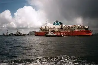A salvage operation, conducted by Dutch company Smit-Tak Towage and Salvage (part of Smit International), was embarked upon almost immediately to refloat the ship. The operation included parbuckling and was successfully concluded in late April 1987, allowing the remaining bodies trapped underwater to be removed. The ship was towed to Zeebrugge, and then across the Western Scheldt to the yard of De Schelde in Vlissingen (Flushing, Netherlands), where her fate was decided. It had originally been assumed that she could be repaired and continue sailing. No buyer was found, however; she was sold to Compania Naviera SA of Kingstown, Saint Vincent and the Grenadines, for scrapping. She was renamed Flushing Range and the Townsend Thoresen branding painted over before her final sailing to a scrapyard at Kaohsiung, Taiwan.[36] She began her final voyage on 5 October 1987, together with MV Gaelic, towed by the Dutch tug Markusturm.[37] The voyage was interrupted for four days when the ships encountered the Great Storm of 1987 off Cape Finisterre, where Herald of Free Enterprise was cast adrift after its tow rope parted,[38] resuming on 19 October 1987. The hull began to disintegrate while off the coast of South Africa on 27 December 1987, and had to be towed into Port Elizabeth on 2 January 1988 to undergo temporary repairs to allow her to continue her voyage. She finally arrived in Taiwan on 22 March 1988.[39]