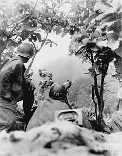 The Model 1917A1 was again used in the Second World War, and was primarily used with the M2 ball, tracer, and armor-piercing ammunition introduced just prior to the outbreak of hostilities. Some were supplied to the UK for use by the Home Guard since all production of the .303 Vickers was needed to resupply the equipment abandoned during the Fall of France. The M1917's weight and bulk meant that it was generally employed as a fixed defense or as a battalion or regimental support weapon. In this latter role, the disassembled weapon was carried by machine gun squads advancing on foot, which could rapidly deploy it to support the infantry in offensive operations.[8] At the battle of Momote Airstrip in the Admiralties, the US Army's 5th Cavalry machine gunners killed several hundred Japanese in one night using their M1917 Brownings; one gun was left in position after the battle as a memorial to the desperate struggle.[9]