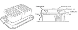 The M1936 (Mle1936) is a French light anti-tank mine used during the Second World War. The mine was captured in large numbers by the German army after the Fall of France, and was later used in the Atlantikwall, North Africa and Italy. The mine consists of a base plate on top of which is a rectangular steel box containing an explosive charge. On top of the container are two M1935 or M1936 pressure fuzes. A pressure cover is fixed on top of the container by wires attached at either end of the container. Two pressure bars are welded to the inside of the pressure cover, each one is directly over a fuze—however, each bar has a recess preventing it from pressing on the pressure fuze, until a safety bar is inserted. The safety bar covers the recesses allowing the pressure cover to bear down directly on the pressure fuzes.