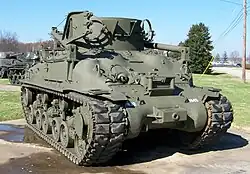 It had a Spicer manual synchromesh transmission, with one reverse and five forward gears.[2] The suspension was VVSS for earlier variants, and HVSS for later variants, demarcated with an "A1" suffix after the model number. It had between 0.5–2 in (13–51 mm) of armor depending on location. It had an armament that consisted of an 81 mm mortar, which was used to cover emergency retreats using smoke rounds, one 0.5 in (13 mm) M2 Browning machine gun, and one 0.3 in (7.6 mm) M1919 machine gun. There were 20 hand grenades (Fragmentation Mk.II), and six smoke grenades in the crew compartment. The armament was used only for self-defense, as the vehicle was not designed to be used as an offensive weapon.[5]