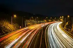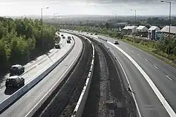Most of these interchanges were subject to high levels of traffic congestion, as was the former toll plaza north of the West-Link bridge. The busier roundabout junctions were signal-controlled, with tailbacks extending for several kilometres at rush hour. The most infamous was the Red Cow Roundabout junction with the N7, jokingly dubbed the "Mad Cow Roundabout".[2] As well as being the junction of two of the busiest roads in the State, the Luas tram Red Line from Tallaght to the city centre used to cross two slip roads at-grade, before continuing city-bound in the median of the R110 (formerly N7). As part of the M50 upgrade works (see below), these at-grade crossings were removed, and in December 2008, the completely reconstructed interchange was open. This greatly reduced the congestion at the once-notorious traffic black spot.