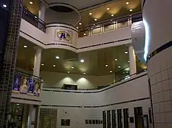 On the first floor are located the main and auxiliary lobbies, restrooms, gymnastics training area, and athletic department offices. The Varsity K Hall of Fame is located outside the southern arena doors. There is also a display showing all the donors who have endowed scholarships to athletics. The main lobby is three stories high and was built as part of the 1992 renovations on what was originally the swimming pool. It includes an elevator, concession stands, the Steve Milkovich Family Ticket Office, team shop, the Laing and Saundra Kennedy Blue and Gold Trophy Room, and the Scolin MacLean Donor's Lounge (nick-named "The Scolly Bear Lair") which houses the offices of The Golden Flashes Club. The four auxiliary lobbies are located at each corner of the arena and provide access to restrooms, drinking fountains, and stairs to the balcony sections. Football office are located near Lobby A, Men's Basketball offices near Lobby B, Women's Basketball offices near Lobby C, and Volleyball offices are located near Lobby D.