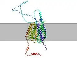 The peptide sequence contains 11 transmembrane regions that cross the plasma membrane. Additionally, there are also two MFS regions starting at the 28th and 368th encoding amino acids.[10]