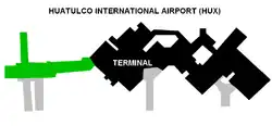 Huatulco International Airport (Spanish: Aeropuerto Internacional de Huatulco)[α] (IATA: HUX, ICAO: MMBT) is an international airport located in Santa María Huatulco, in the State of Oaxaca, Mexico.[2] The airport manages both domestic and international air traffic for the southern and southeastern Pacific coast of Oaxaca, and it serves as an international gateway to the Mexican tourist destination of Huatulco and the Costa Region of Oaxaca. The airport is owned by Aeropuertos del Sureste (ASUR).