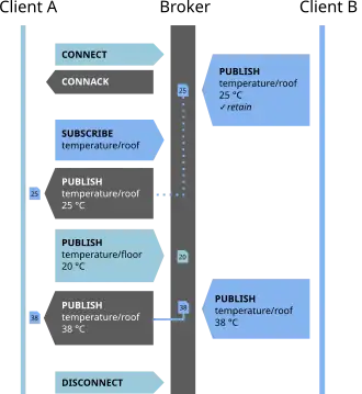 Example of an MQTT connection (QoS 0) with connect, publish/subscribe, and disconnect. The first message from client B is stored due to the retain flag.