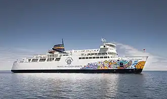 A trip aboard Chi-Cheemaun is a long standing Great Lakes tradition dating back to the 1930s when a small, wooden vessel, Kagawong, first ferried vehicles across the Georgian Bay between Tobermory and South Baymouth.[1] It features a drive-on, drive-off bow and stern loading and unloading through a visored bow system and a square door stern section. The ship is 111 m (364 ft 2 in) long with a 19 m (62 ft 4 in) beam and has capacity for 648 passengers and 143 vehicles, including room for large highway vehicles such as buses and transport trucks.
