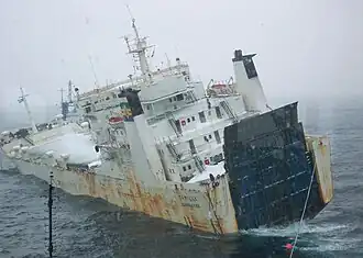 On May 1, 2002, Camilla was laid up in the port of Mariehamn, Finland. According to the Finnish investigation report, maintenance work on the ship was intended to be carried out during the lay-up, but did not actually take place. On December 31, 2002 the ship departed Mariehamn for Canada in ballast for a cargo of paper. During the sailing, it was noticed that the ship's fuel had been contaminated with water, requiring a transition to burning light oil, and that engine lubrication oil required continuous filtering. The exhaust valves of the main engine also saw attention many times during the trip. After loading her cargo in Dalhousie, New Brunswick, Canada, the ship left for England on January 19, 2003. On Jan 23rd 05:40z the main engine stopped at sea, causing a black out. The engine failed with alarms and was restarted several times each time with some increasingly worrying signs of disrepair. At 09:36z it was discovered that one of the crank shaft bearings was overheating with mechanical noise emerging from several of the cylinders. At 10:45z the engine was declared inoperative. The engineers initially set out to repair the engine, but the master's decision at 13.48z that the ship would be evacuated halted the work. A hurricane was closing in, the repairs would take up to 36 hours, and even in the best case the ship's propulsion would be limited. The ship was then at 46°54.7′N 46°50.9′W / 46.9117°N 46.8483°W and rolling 30-40 degrees. The crew ate dinner, closed all the hatches and valves and prepared to leave the ship. The ship's Stork-Werkspoor engine type was deemed in the Finnish investigation report to be very sensitive to the quality of its lubrication oil owing to a design feature, and the type had also received a general design revision to the crank rod bearings and the connecting rods. The engine type was also known to collect sticky oily residue in the general crankshaft area even when carefully maintained. The engine on board Camilla had both unrevised and revised parts installed, but the parts to fail were all of the unrevised design. The investigation board concluded that the most probable cause for the engine break down was imperfect lubrication of the main engine.[6] The imperfect lubrication was a result of several factors, as detailed in the full report.