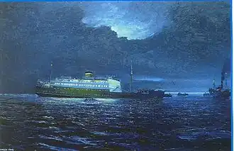 MV Munster was a passenger ship built by Harland and Wolff for the British and Irish Steam Packet Company in 1937.[2] She and her sister MV Leinster took up their intended service between Liverpool and Dublin in 1938. Their original buff hulls were later changed to dark green.[2] Although they were the largest vessels in the Coast Lines fleet, they did not have capacity for cattle on the Dublin route. Two cattle carriers were added to the fleet: Kilkenny (1,320 tons from the Liffey Dockyard), and Dundalk (630 tons from Ardrossan, Scotland).[3][4]