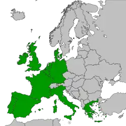 Having "resolved to achieve the strengthening and the convergence and to establish an economic and monetary union including,... a single and stable currency",[32] the Treaty ruled that "Member States shall regard their economic policies as a matter of common concern", and that the obligations assumed should be a matter for "mutual surveillance".[33] Commonly known as the Maastricht criteria,[34][35] these obligations represented the performance thresholds for member states to progress toward the third stage of European Economic and Monetary Union (EMU), the adoption the common currency (designated at the 1995 Madrid European Council as the Euro).[36]