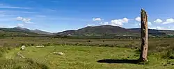 Machrie Moor 2 (grid reference NR91143241) is the most visually striking of the circles on Machrie Moor.[1] This circle has a diameter of 13.7 metres, and may originally have consisted of seven or eight tall sandstone slabs, three of which survive intact, while stumps of others may be seen.[9] The heights of the three intact stones range from 3.7 metres to 4.9 metres.[9] Within the circle are two large stones, apparently cut from a fallen pillar, one of which now has a central hole as if for conversion to a millstone.[9] Excavations in 1861 revealed a cist in the centre of the circle.[9] A food vessel was found in this central cist.[1] A second, empty, short cist was found between the centre and the northeast upright stone.[9]