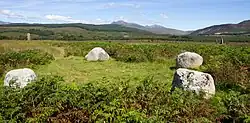 Six stone circles are visible on the moor immediately east of the derelict Moss Farm.[1] Some circles are formed of granite boulders, while others are built of tall red sandstone pillars.[1] The moor is covered with other prehistoric remains, including standing stones, burial cairns and cists.[1] The stone circles are positioned over previous timber circles.[2] A radiocarbon date of 2030 ± 180 BCE has been found for the timber circle at Machrie Moor 1.[3] Several hut circles can also be seen as low rings of turf-covered stone.[1]