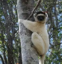 One characteristic in common with other tropical and subtropical dry broadleaf forests is the presence of relatively high densities of mammalian biomass. Several of Madagascar's characteristic lemur species are found here including the fat-tailed dwarf lemur, five subspecies of Propithecus, three species of Lepilemur, and five species of Microcebus. Endemic mammals include three endangered species, golden-crowned sifaka (Propithecus tattersalli) and Perrier's sifaka (Propithecus diadema perrieri) and western forest rat (Nesomys lambertoni) as well as mongoose lemur (Eulemur mongoz), golden-brown mouse lemur (Microcebus ravelobensis), northern rufous mouse lemur (M. tavaratra), pygmy mouse lemur (M. myoxinus), Milne-Edwards' sportive lemur (Lepilemur edwardsi), and greater big-footed mouse (Macrotarsomys ingens). As well as lemurs the dry forests are home to the island's largest predator, the fossa (Cryptoprocta ferox) and some smaller carnivorans.[2]