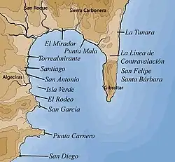 Gibraltar's Islamic history began with the arrival of Tariq ibn-Ziyad on 27 April 711 at the start of the Umayyad conquest of Hispania. Traditionally, Tariq was said to have landed on the shores of the Rock of Gibraltar, which was henceforth named after him (Jabal Ṭāriq (جبل طارق), English: "Mountain of Tariq" – a name which was later corrupted into "Gibraltar" by the Spanish).[1] However, according to one early Islamic account, Tariq "cast anchor close to a mountain which received his name", rather than actually landing at Gibraltar. Another account, by the 9th-century Egyptian historian Ibn 'Abd al-Hakam, describes Gibraltar as lying between the points of departure and disembarkation rather than being the actual landing place.[3] According to this account, the possibly legendary Julian, Count of Ceuta – an ally of Tariq who was estranged from Roderic, the Visigothic king of Hispania – transported the Muslim forces in ships which "in no way seemed different from" those which "plied across the Strait for trade."[4] Spanish accounts corroborate this with the detail that the invasion force was transported "in merchant ships that the reason for their crossing should not be apperceived."[4] Gibraltar would have been a poor place to land due to its relative isolation and difficult rocky terrain, and it is more likely that Tariq either landed in the vicinity of the former Roman colony of Carteia at the head of the Bay of Gibraltar[5] or on the Alboran coast north of Gibraltar around La Tunara (now a barrio of La Línea de la Concepción in Spain), where a landing would have been less conspicuous.[6]