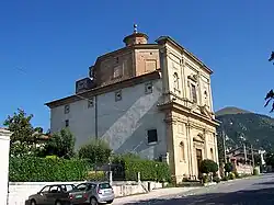 The church construction began in 1662 to house an image of the Madonna del Prato that was held to be miraculous. The plain façade with two statues does not prepare the visitor for the interior, which is a near-replica of the interior space and ordering of San Carlino alle Quattro Fontane, one of the masterpieces of Baroque architecture in Rome, by Francesco Borromini. The architectural plan is attributed to Carlo Perugini, but there is evidence Borromini may have played a direct role.[1] The dome, which in Rome is populated by geometric crosses, was frescoed by Francesco Allegrini and Louis Dorigny (1677–1678). The church also has altarpieces by Ciro Ferri, Gaetano Lapis, and Domenico Maria Viani.[2]