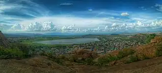 Madurai is located at 9°56′N 78°07′E / 9.93°N 78.12°E.[59] It has an average elevation of 134 metres. The city of Madurai lies on the flat and fertile plain of the river Vaigai, which runs in the northwest–southeast direction through the city, dividing it into two almost two equal halves.[60] The Sirumalai and Nagamalai hills lie to the north and west of Madurai. The land in and around Madurai is utilised largely for agricultural activity, which is fostered by the Periyar Dam.[61] Madurai lies southeast of the western ghats, and the surrounding region occupies the plains of South India and contains several mountain spurs.[62] The soil type in central Madurai is predominantly clay loam, while red loam and black cotton types are widely prevalent in the outer fringes of the city. Paddy is the major crop, followed by pulses, millet, oil seed, cotton and sugarcane.[63]