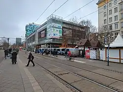Magdeburg's Christmas market dates back to a late medieval sales fair, which gave the people of Magdeburg the opportunity to stock up on food before winter.[3] In the middle of the 20th century, it became a pre-Christmas custom. In the beginning, it took place in the area of the Alter Markt (Old Market). After large parts of Magdeburg were bombed in 1945,[4][5] the Christmas market was moved to the Leiterstraße.[3] In the 1970s, it was moved back to the Alter Markt and also to the Zentraler Platz. After the construction of the Allee-Center on the Central Square in 1995, it has only been held on the Alter Markt since then.[6] On December 26, 2012, Germany's longest Christmas song was performed on the Magdeburg Christmas market by artists, celebrities and the Christmas market band; the song was created on the initiative of the Volksstimme newspaper, whereby readers of the magazine wrote additional verses to the melody of the German christmas carol Kling, Glöckchen, klingelingeling.[7] In 2015, the Magdeburg Christmas market had over one million visitors.[8]