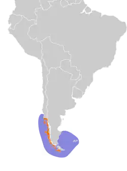 The Magellanic diving petrel breeds on vegetated slopes on coastal and nearshore islands, typically in fjords and channels, in southern Chile, Argentina, and Tierra del Fuego and forages in offshore and inshore waters in the area.[7]
