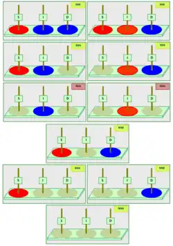 This first stage is similar to the n = 2 puzzle described above, which also takes four moves, where the D and I posts are interchanged. However, it is not identical to the n = 2 puzzle due to the presence of the large disk on the S post, which "colors" it red. This means that a disk can only be placed on this post with its red side facing upwards.